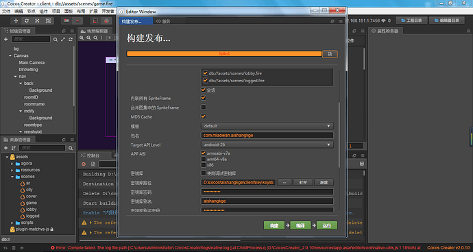cocos creator打包安装项目的时候成功了,但是点击下面编译按钮后,提示编译失败,以下是编译日志,你们看下,能帮我解决下,着急!native.zip (1.9 KB)
