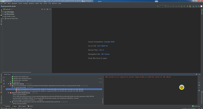 ABIs [armeabi] are not supported for platform. Supported ABIs are [arm64-v8a, armeabi-v7a, x86, x86_64] 这个是你的报错。