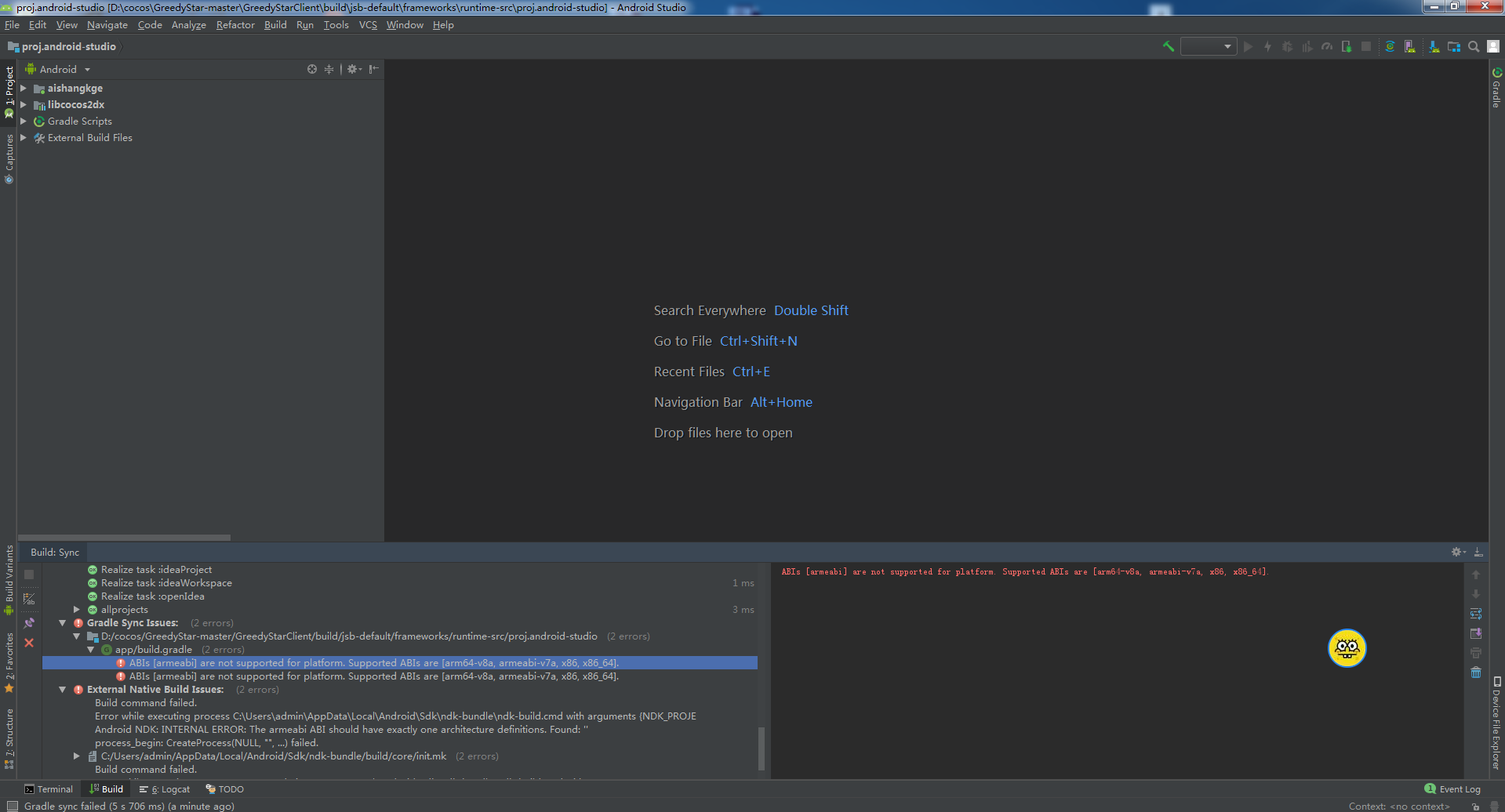 Projects loaded. Root project using build file ‘D:\cocos\aishangkge\client\build\jsb-default\frameworks\runtime-src\proj.android-studio\build.gradle’.