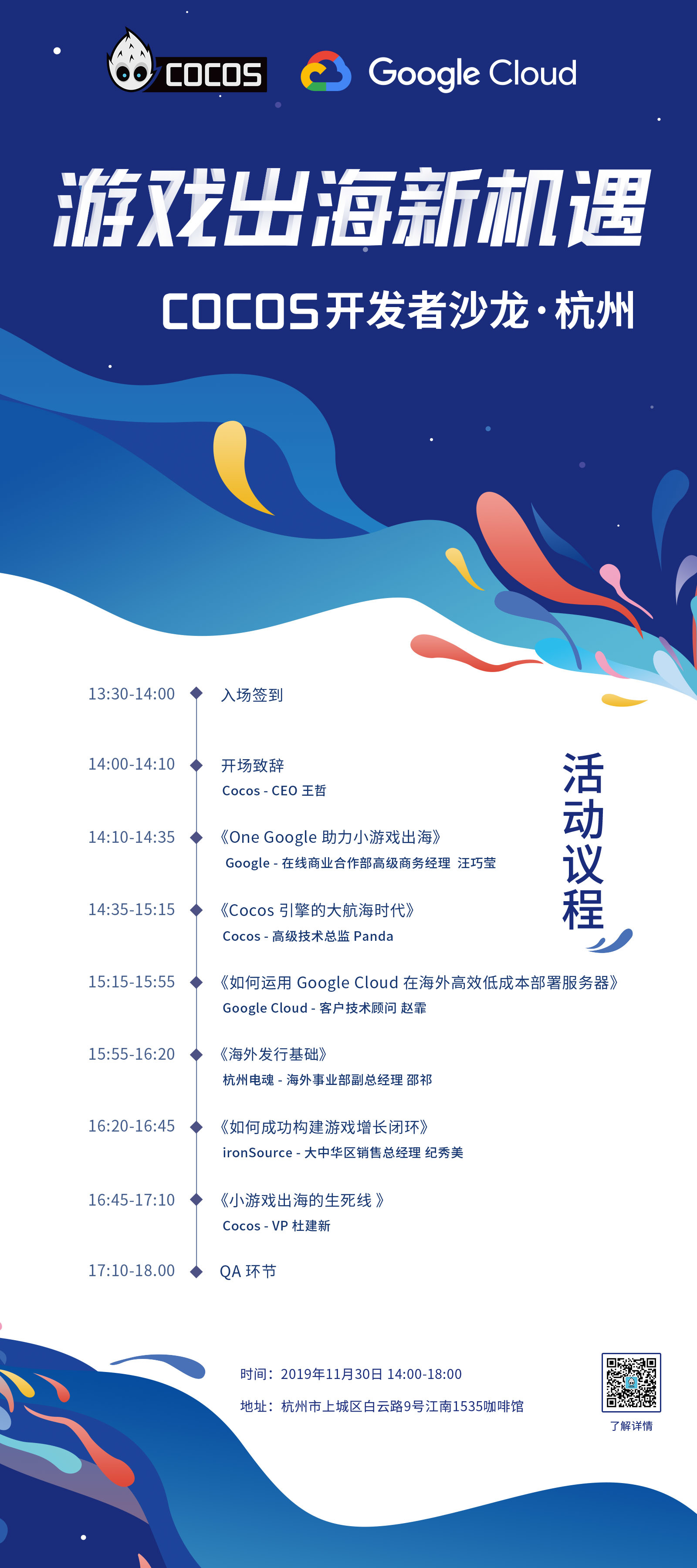为了给各位游戏开发者的航海之路蓄力,11月30日 Cocos 将携手 Google Cloud 在美丽的杭州举办开发者沙龙,围绕开发者所关心的核心问题,帮助各位掌握海外市场趋势、游戏产品全球化实战思路,以更低的成本获取更高的收益,精准出海。