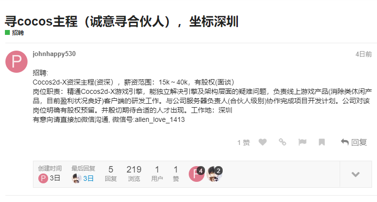 Cocos2d-X资深主程(资深),薪资范围:15k~40k,有股权(面谈)