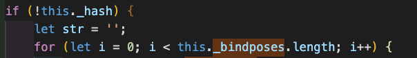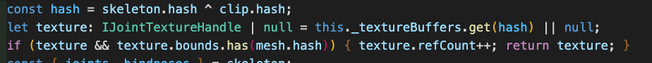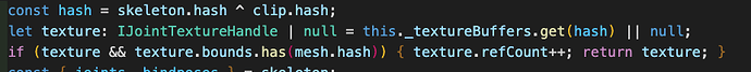 在计算骨骼动画纹理贴图时,根据骨骼的hash和动画的hash去寻找是否已经有缓存的动画贴图。骨骼的hash是根据姿态数据进行计算的。
