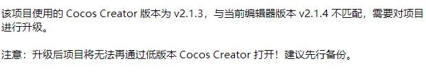 很显然,我这里奇怪的是:以前各个版本,只要是同2.0.x,一步步升级cocoscreator而打开旧项目时,无此类提示。