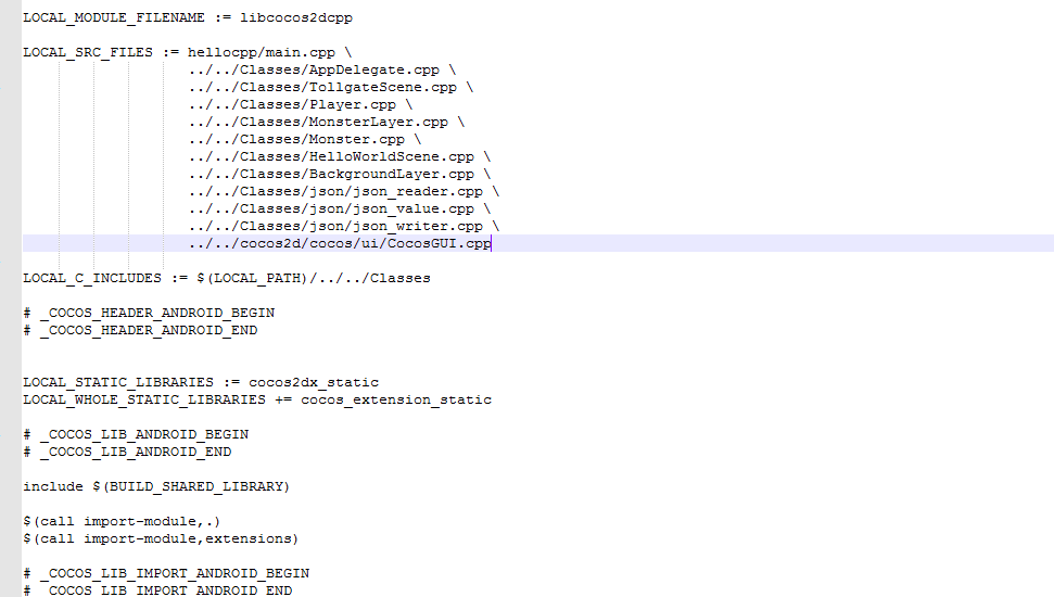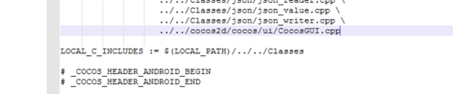 在LOCAL_MODULE一行看到的名字我在jni中的mk文件也添加了,如代码: LOCAL_WHOLE_STATIC_LIBRARIES += cocos_ui_static,下面的call那一行代码也添加了ui,如代码: $(call import-module,ui)