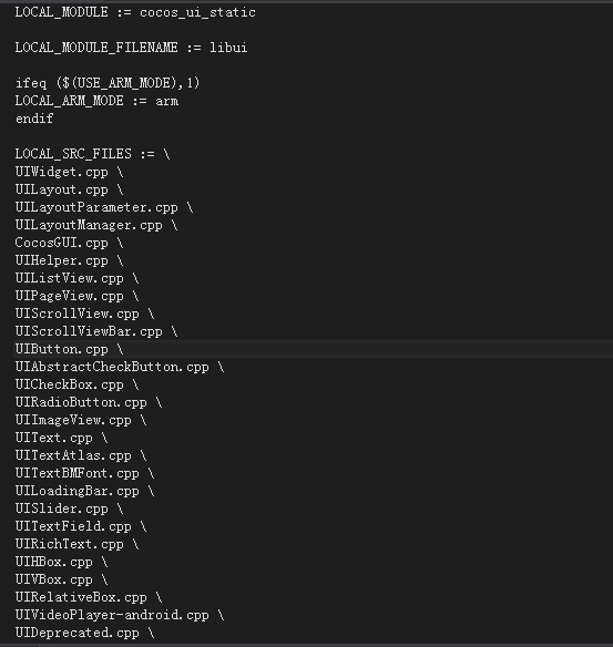在cocos2d/cocos/ui目录下也就是CocosGUI的同级目录下,有一个mk文件,包含了CocosGUI.cpp