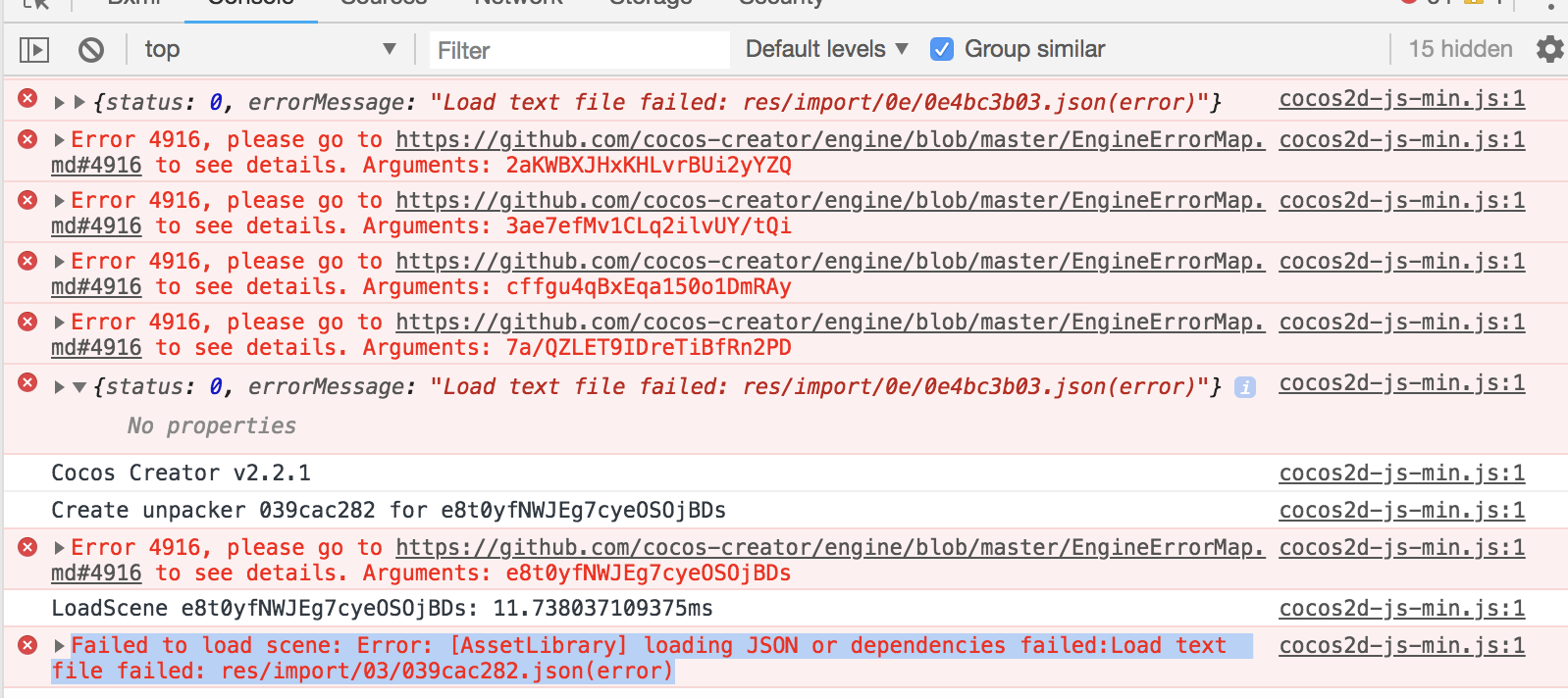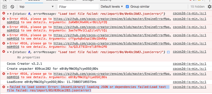重现方式:重新构建项目的时候,偶现 cocos2d-js-min.js:1 Error 4916, please go to https://github.com/cocos-creator/engine/blob/master/EngineErrorMap.md#4916 to see details. Arguments: e8t0yfNWJEg7cyeOSOjBDs Failed to load scene: Error: [AssetLibrary] loading JSON or dependencies failed:Load text file failed: res/import/03/039cac282.json(error)