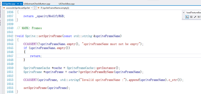 pWidget->init中的第二个参数是 “”,当TextureResType是TextureResType::PLIST时setSpriteFrame会进入 CCASSERT(!spriteFrameName.empty(), “spriteFrameName must not be empty”);
