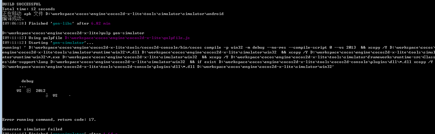 自己clone下来的cocos2d-x-lite,切换到v1.3,gulp gen-libs成功,但是运行gulp gen-simulator出现错误,如下图,大家有遇到这样的问题吗?