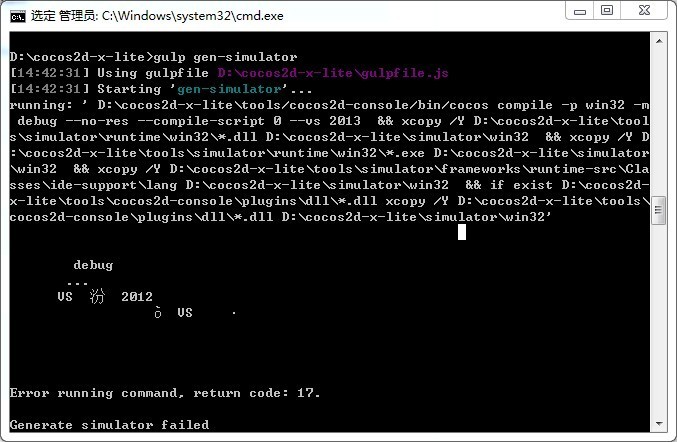 直接使用 tools/cocos2d-console/bin/cocos.bat gen-simulator -p=win32 就可以了,这个 gulp 脚本写死的是 vs2013,你安装的 vs2015 所以不行。