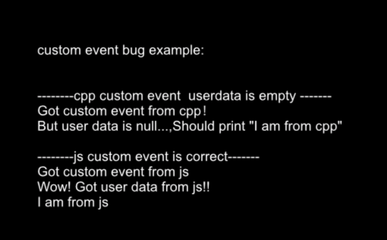 从cpp发送的自定义事件,如果带有userData,这个userData 在传递给JS端的时候会被抛弃。