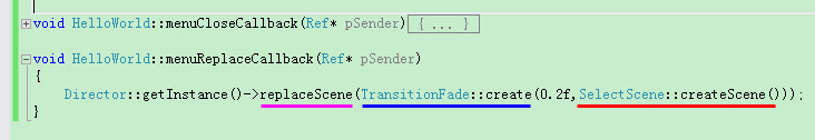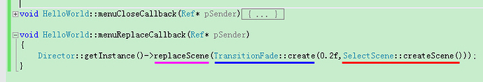 2.这里虽然只有一行代码,但是比较长,因为这是第一次接触这种样子的代码所以来仔细分析。Director::getInstance()->不需要管,只要记住以后凡是转场代码开头都要加这个就可以了。后面的东西看起来比较乱但是梳理一下会发现3个部分,已经用不同颜色的线条标明。首先来看最外面的replaceScene(),顾名思义就是替换场景,替换成什么场景就是括号里面的内容。其次看中间的TransitionFade::create(),乱就乱在这里,实际上如果只是替换场景不需要加这句,这句的功能是在转换场景时增加一个转场特效:变暗转场。TransitionFade是一种特效,其他的特效可以去官网查看,有了特效转场就不会显得特别突兀,因此还是必要的。现在再来看就比较明白了,创建这个特效需要提供两个参数,这就是create()里面的内容,一个是0.2f,一个是SelectScene::createScene()。前者是特效时间,后者是调用SelectScene场景类里面的创建场景函数,这也是我们最初的思路。整个这句代码的意思就是给SelectScene::createScene()附加一个特效,并使用这种方式替换当前场景。