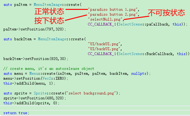 进入初始化函数进行整体布局,使用的完全是从HelloWorld.cpp中学习的技巧:建立精灵、放置、加入图层,创建按钮、绑定函数、放置,创建menu、加入按钮、放置。以下仅仅给出一个局部,另外两个按钮以此类推。下方的return true是初始化函数的结尾。