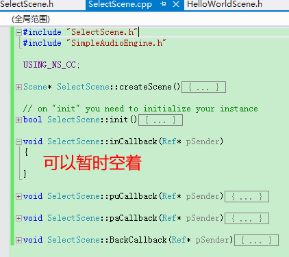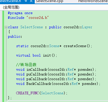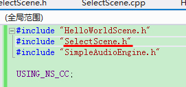 然后看.cpp,首先需要引入SelectScene.h,这样使得我们可以使用SelectScene场景类的声明,