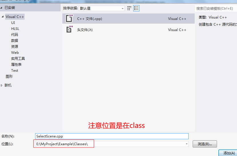 另外当初我还碰到一个怪事,就是位置这里不能更改,是灰色锁死的。于是我就只能在proj.win32中建立然后手动复制过去。 如果有人遇到这种情况可以这样处理:首先copy一下HelloWorldScene.cpp和.h,改个名字,然后在VS中右键class->添加->现有项,在弹出窗口中选择新复制的文件,这样成功导入VS,然后在VS里再改动。