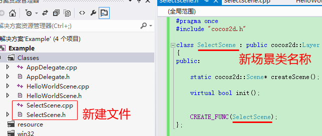 默认位置是proj.win32,但是如果去检查一下Example文件夹会发现AppDelegate和HelloWorldScene是放在class文件夹下,这里的区别很重要。如果放到proj.win32在windows环境下运行没有问题,但是移植的时候会出问题,要把所有程序文件放到class里,所有用到的资源放到resource里。