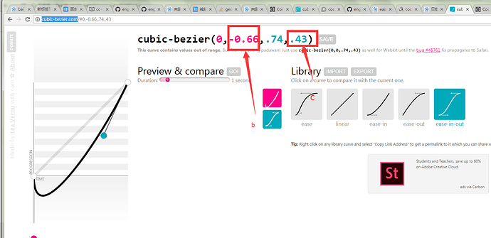 我网上查了一下,确认这个函数的参数不是两个控制点(x1, y1, x2, y2) 这种形式,而是类似于 (y0, y1, y2, y3) 这种形式,y0 和 y3 一般分别填 0 和 1,表示从开始到结束,并且最后一帧动画会在预设的结束位置,换言之,如果 y3 设置的不是 1 则不会在预设的结束位置结束。中间的 y1 和 y2 我猜测可能是两个控制点的 Y 坐标。我不知道这是这个函数的 BUG,还是官方有深意地设定。