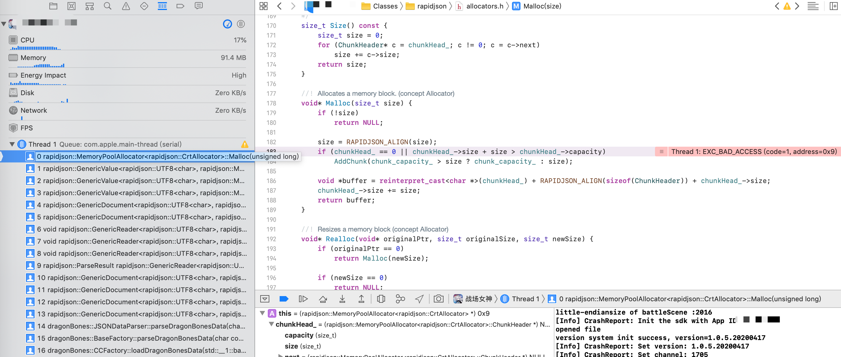 我将dragonbonesCPP里的rapidjson直接替换掉了cocos2d/external/json,在android/ios上运行都没问题,但是用xcode在ipad上调试会报错