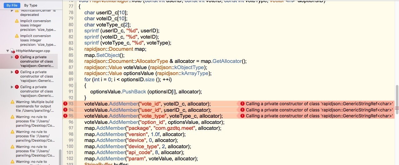 错误提示:/Users/panxiling/Desktop/MyProject/TestPaper/Classes/Manager/HttpNetManager.cpp:96:33: Calling a private constructor of class ‘rapidjson::GenericStringRef’
