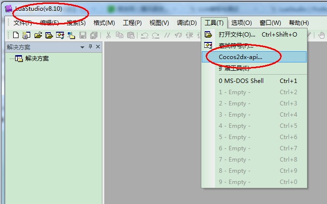 如上图,首先需要LuaStudio8.10及以上版本,点击菜单中cocos2dx-api…