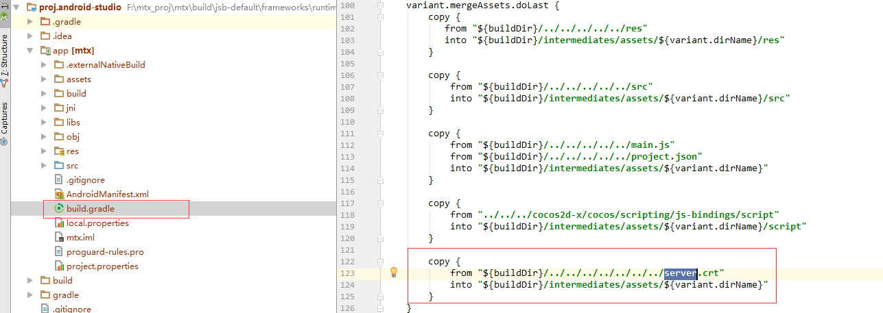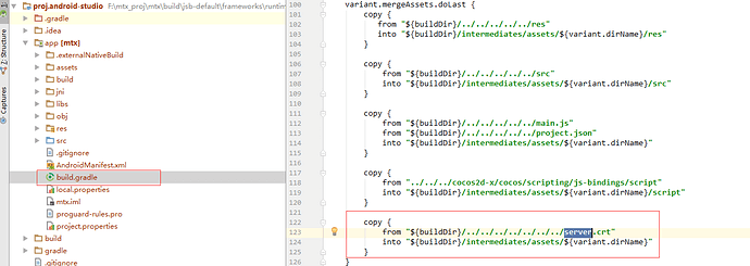 关于证书crt文件,可以放到项目根目录,然后修改project.android-studio/app目录下的build.gradle,加上一句,这样打包的时候就能将crt文件放到assets目录