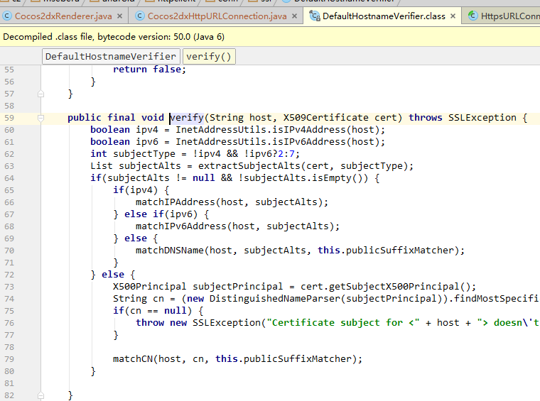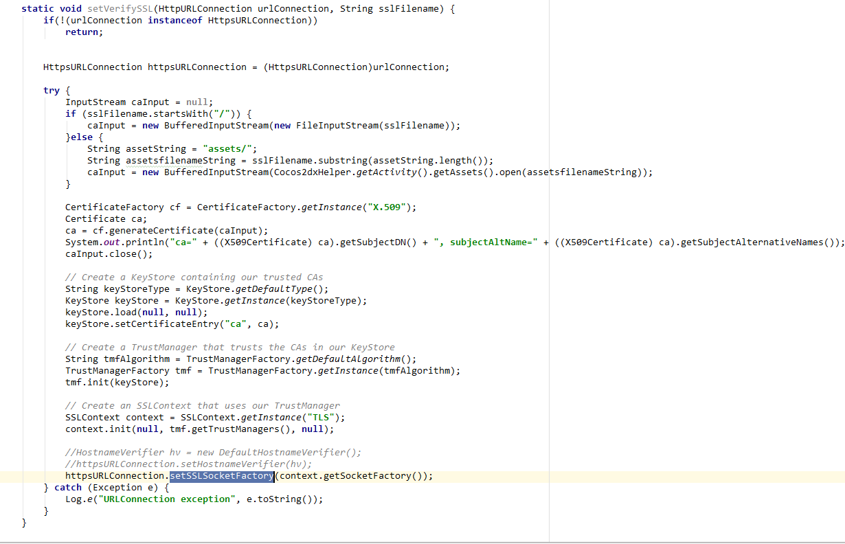 而安卓端HttpClient-android.cpp实际上会调用cocos2d-x\cocos\platform\android\java\src\org\cocos2dx\lib\Cocos2dxHttpURLConnection.java将证书文件传入,相关代码为