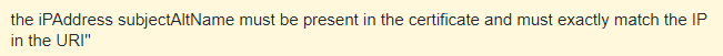这时候生成证书时要求指定证书的subjectAltName,通过subjectAltName附带上服务器ip地址以完成验证。