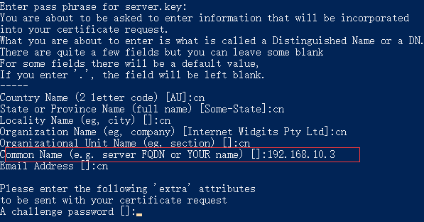 时会要求输入相关信息,在Common Name这一步要注意输入正确的域名,由于我连接的服务器没有域名所以我实际输入了ip。