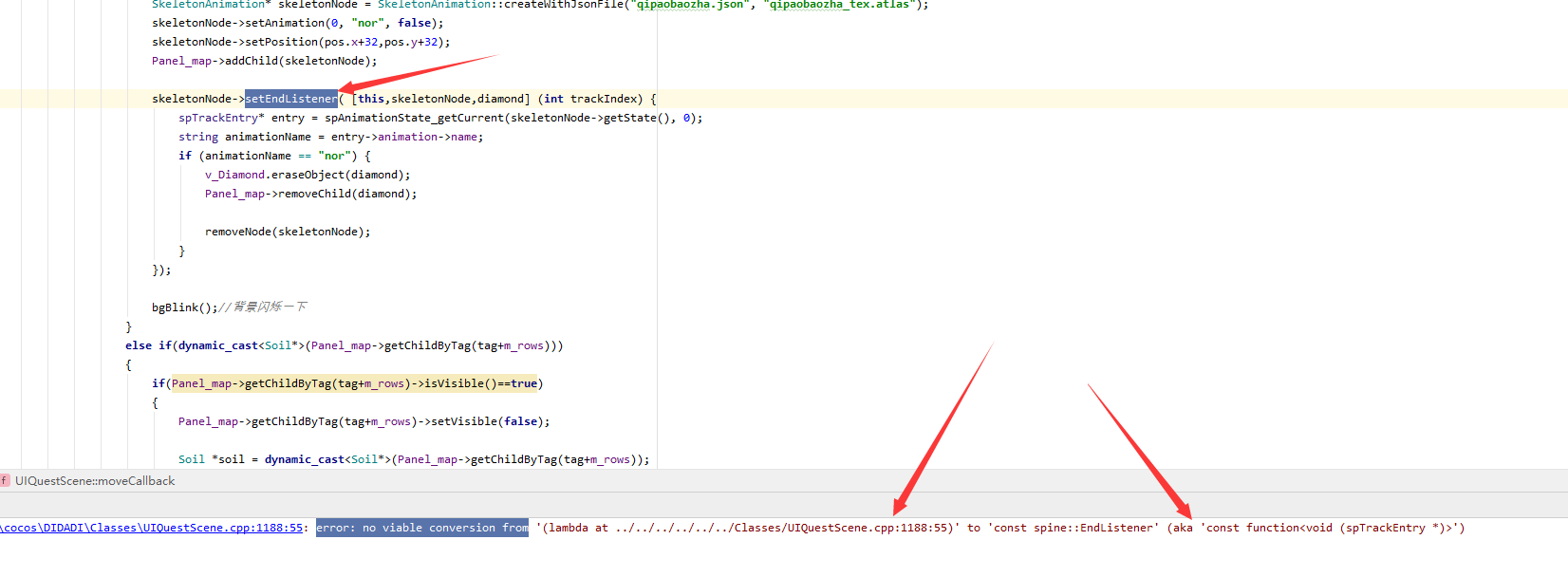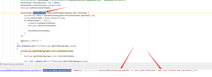 cocos2dx4.0 SkeletonAnimation的setEndListener要怎么设置?求大佬解答!!!!!在android studio中报错如下