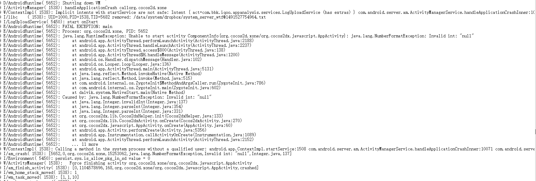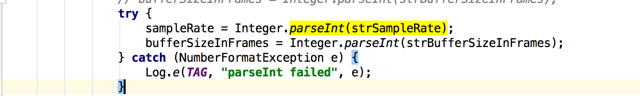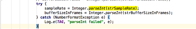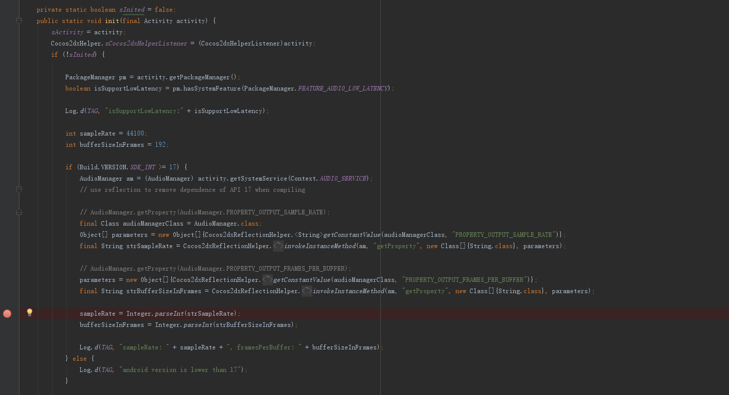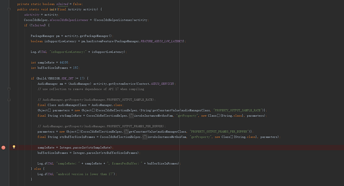 试着跟了一下,发现是 Cocos2dxHelper.java 中,parseInt(strSampleRate) 时,strSampleRate为null导致的。 如图: