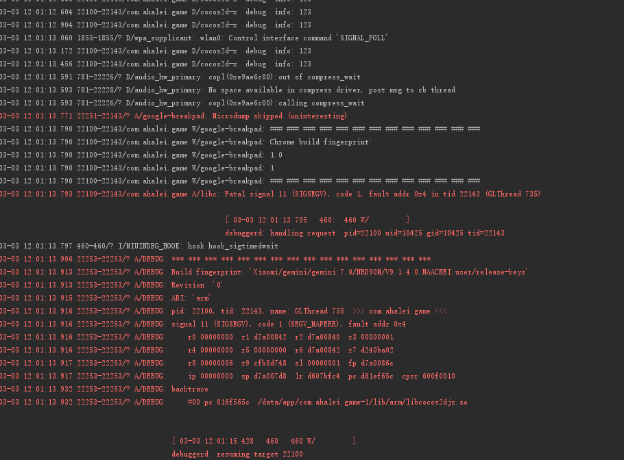 调用JS打印log多次调用后必然会出现闪退现象,闪退日志如下