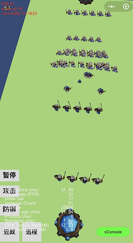 使用一个两个模型刷怪。动画使用了UseBakedAnimation,材质都使用了Use Instancing。在微信平台的Andriod机上,骁龙710的性能还也可以60FPS也大概有一百个怪。但是在微信平台的IOS上,直接腰斩。IPhone11在50个怪的时候只有30的FPS。