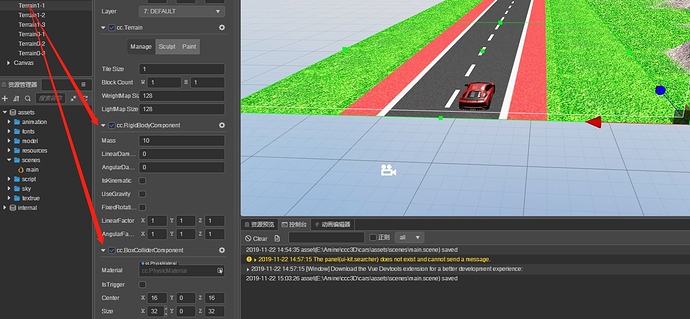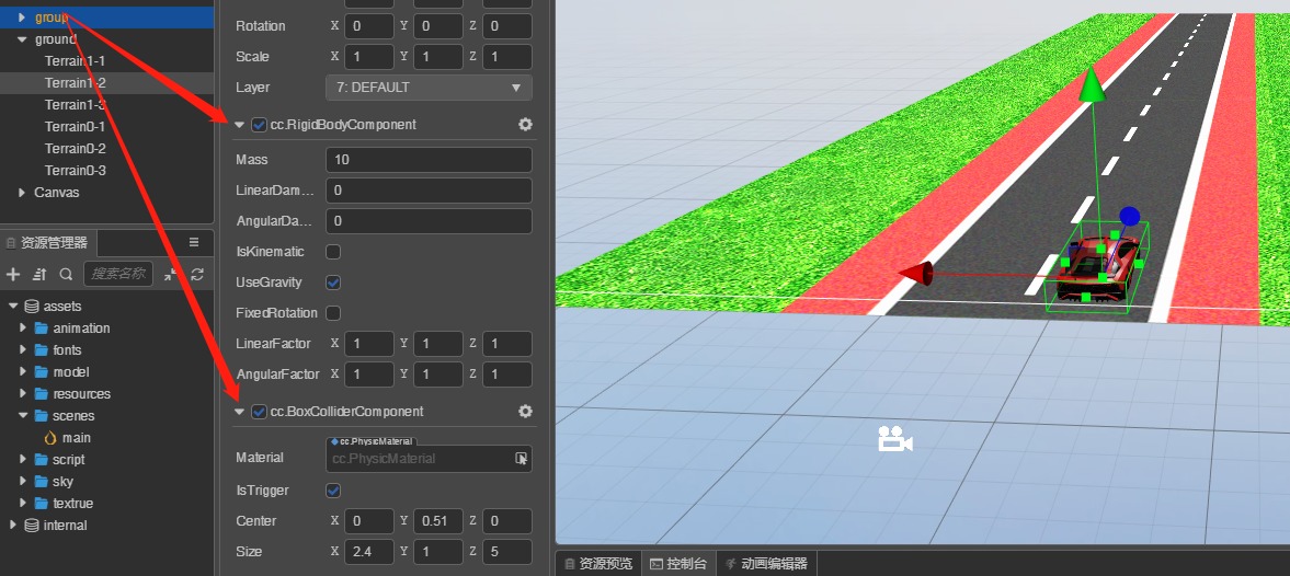 我给地形和模型分别添加刚体和碰撞组件,但是没找到类似于ccc2系列的碰撞分组管理器,汽车模型放在地面上之后直接就掉下去了,尝试了各种各样的方法,目前仍然没有进展,特此求助!