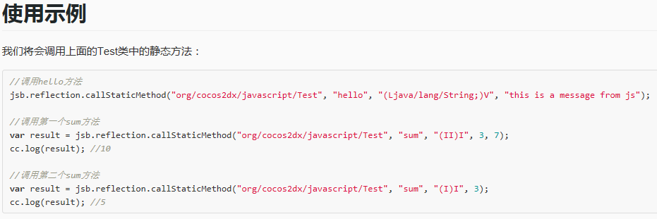 var o = jsb.reflection.callStaticMethod(className, methodName, methodSignature, parameters…)