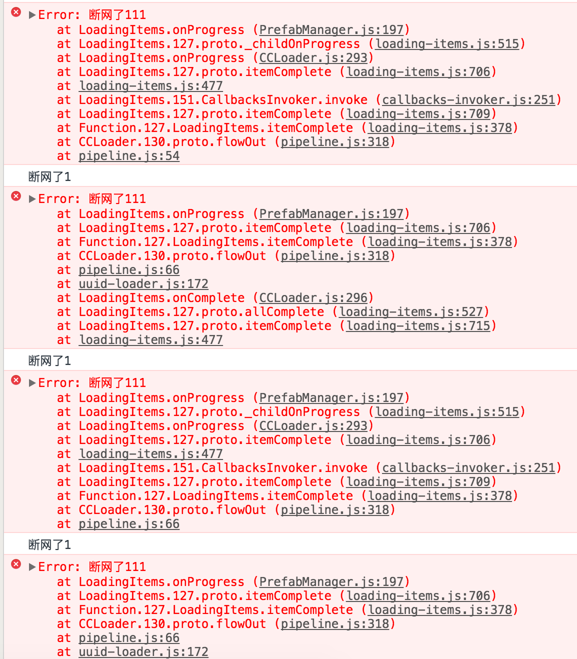 这个接口加载资源的过程中断开网络,会一直打印“断网1”,直到把common文件夹下面的资源全部走完,才会停止,而我们正常的情景是:发起请求下载文件夹下的所有资源,一旦发现网络断了,应该立即停止不必要的剩余资源遍历,等待重新恢复网络后再重新下载