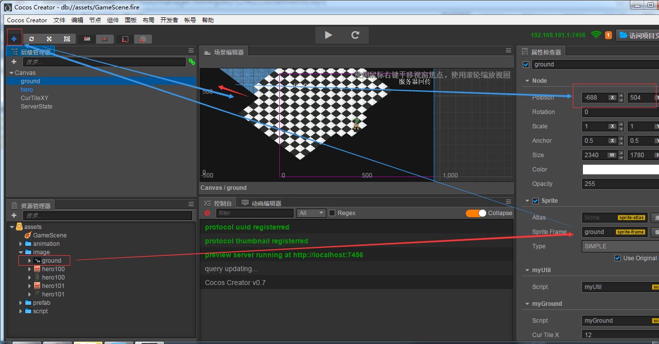 然后点击CocosCreator左上角的移动工具 先粗略调一下位置 使入口的瓦片对准中心位置 然后再到属性检查器中细调具体的位置 (希望加入和ps一样的功能 按方向键调整一个像素 按shift + 方向键调整10个像素) 最后我的调出来是 -688 504 不是很困难