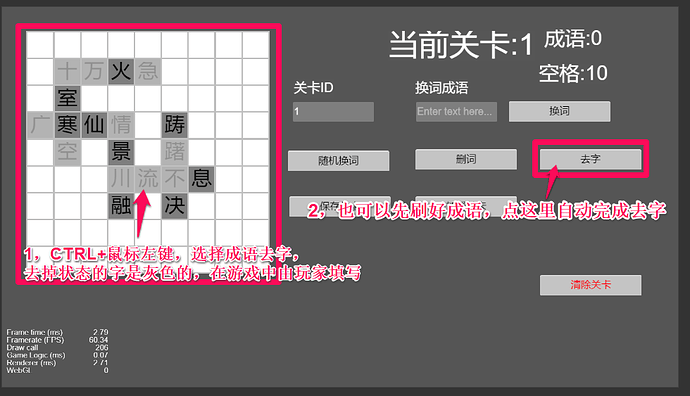 去字功能。 这也是编辑器比较重要的一个功能,因为在游戏中玩家看到的成语都不是完整的需要填空,而去字