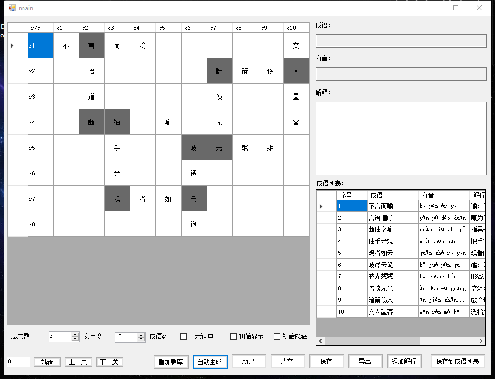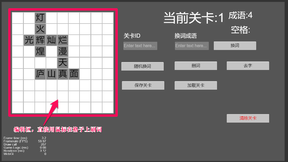编辑成语的方式,应该是随心所欲的在格子上刷出成语,想怎么刷就怎么刷,这样生成关卡才快,你