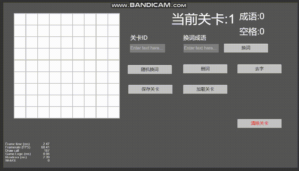 关卡对象组织了格子和成语对象,并且负责对刷成语和换成语/删成语/去字/保存加载等