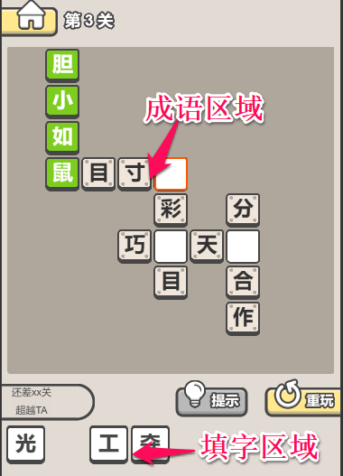 下方填字区域也同样复用Grid 预设,遍历关卡中的成语对象,将带空格属性的字创建为填字对象