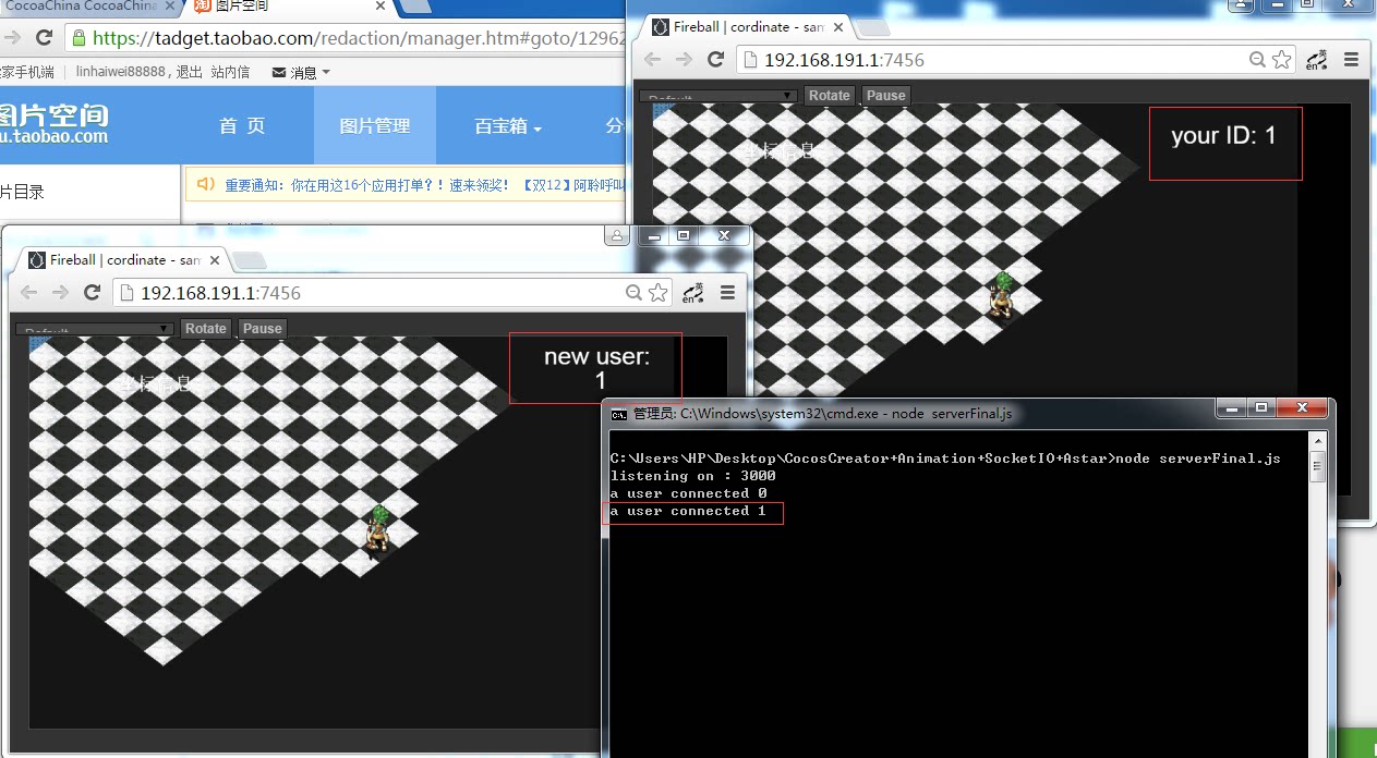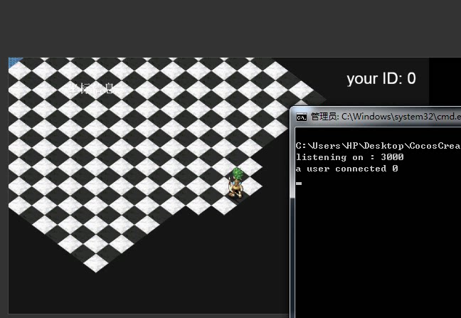然后再运行一个CocosCreator Coordinate 项目 就能看到同步的登录了 已经在线的用户 会收到登录的消息 新登录的用户还是只显示自己的ID 服务器会打印新连接的用户 后面的数字为ID