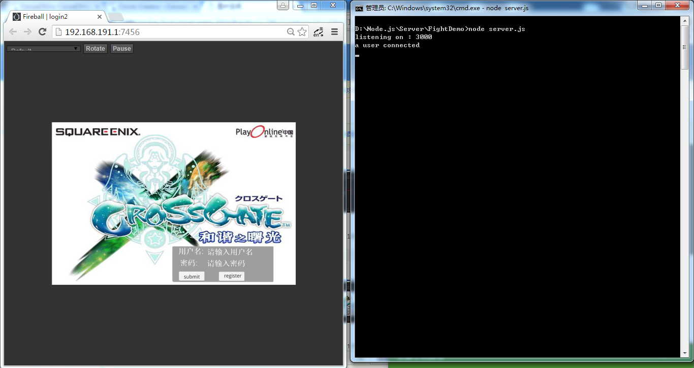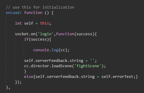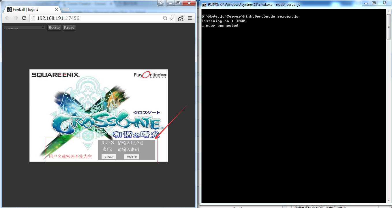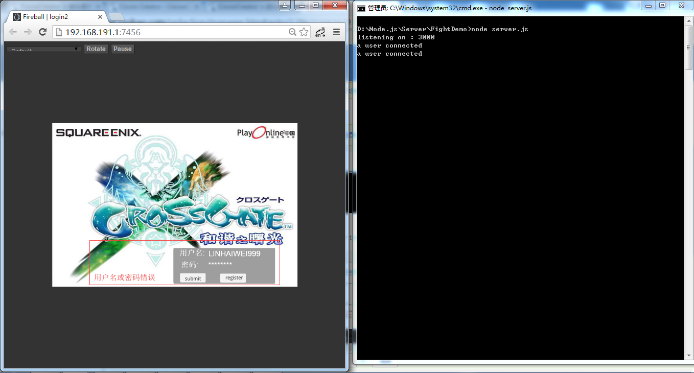 然后在onload中添加服务器回传的消息吧 如果用户名或密码错误 就提示错误并返回 , 否则清空错误 并切换到战斗场景