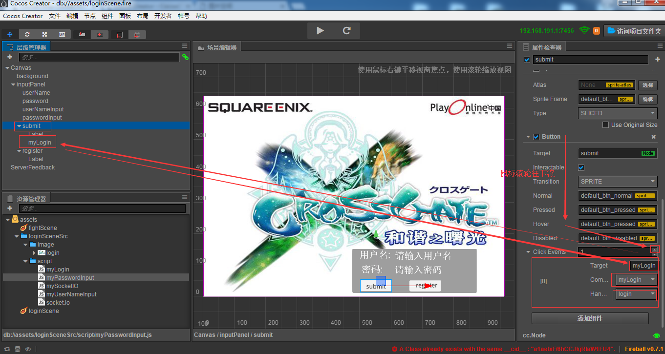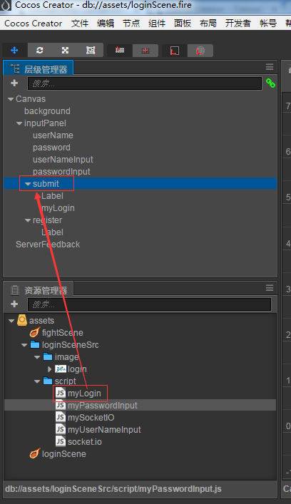 然后添加引用 将myLogin扔到层级管理器submit下