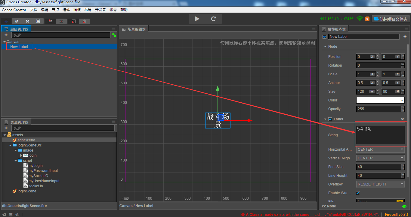 然后选中fightScene 战斗场景的逻辑是下一部分的内容 这里先简单示意一下 我就只新建了一个label 内容改为 ‘战斗场景’