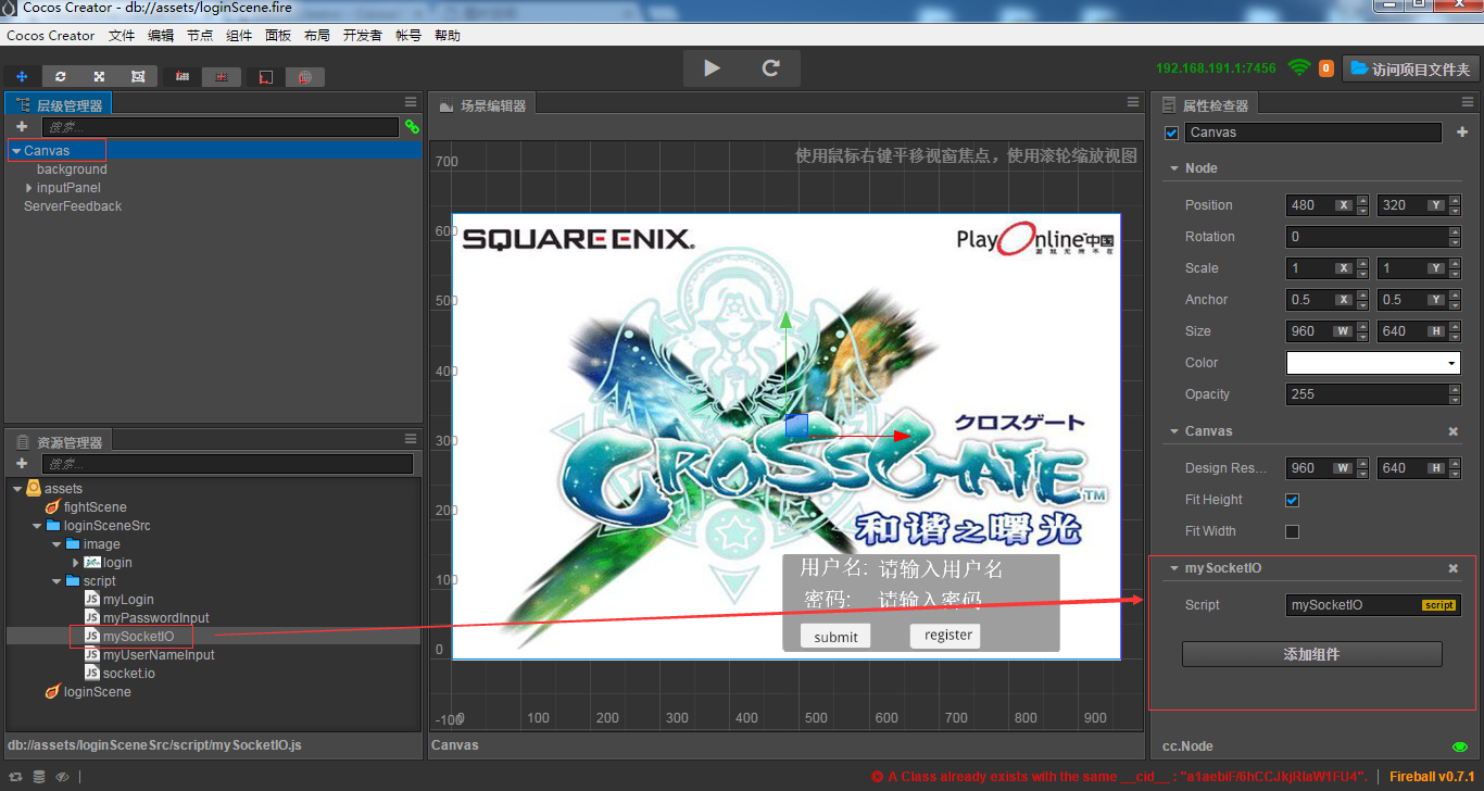 然后将mySocketIO扔到canvas的属性检查器吧