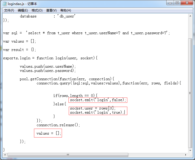 然后打开loginDao.js 敲入下面的代码 与之前教程相同的部分不再介绍 这里我们修改了返回的方式 如果没有这条用户数据 我们返回false代表登录失败 否则将改用户名和密码存为session 变量 并返回true代表登录成功 完成后 values要清空 否则第二次连接会出错