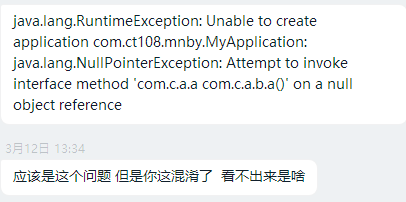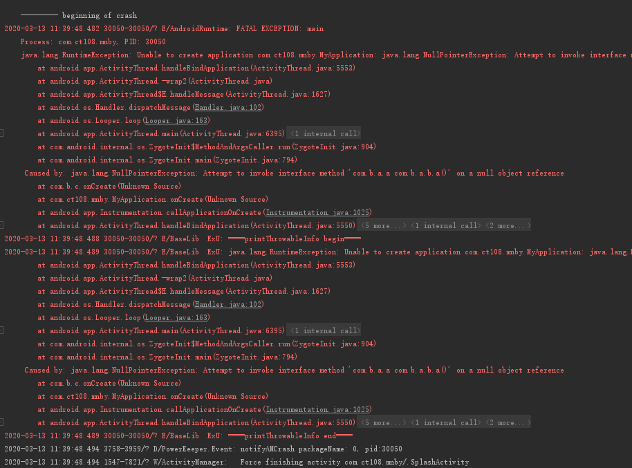 java.lang.RuntimeException: Unable to create application com.ct108.mnby.MyApplication: java.lang.NullPointerException: Attempt to invoke interface method ‘com.b.a.a com.b.a.b.a()’ on a null object reference
