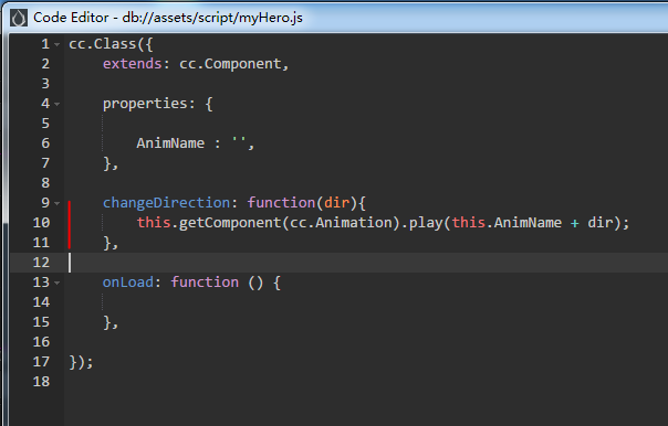 脚本很简答 我们就敲了6行代码 首先在properties中添加了动画名 AnimName 供changeDirection函数调用
