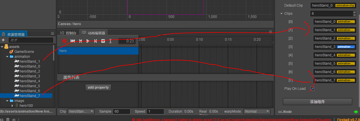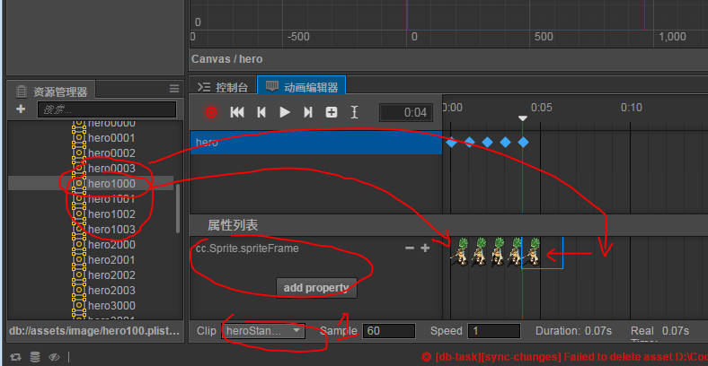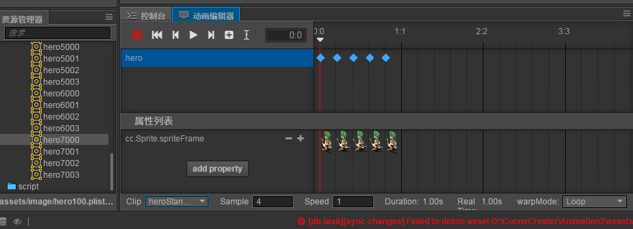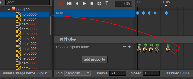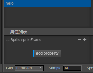 然后呢 我们看到动画编辑器最下面一栏 开头的 Clip 选为 heroStand_1 后面就如法炮制吧 动画编辑器 属性列表 点击 add Property cc.Sprite.spriteFrame 选择hero1000~hero1003 拖到 下方帧列表中 再单独拖动hero1000到6 或7帧的位置 往回拖到第4帧后面 动画编辑器最下面一栏 Sample 改为4 warpNode改为Loop