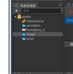 然后在资源管理器就能看到我们新建的动画了 在右侧的属性管理器里面也能看到新加的Animation组件 至于上面的是什么功能 等会就知道了 先将属性管理器里面的heroStand_0扔到Animation文件夹里面