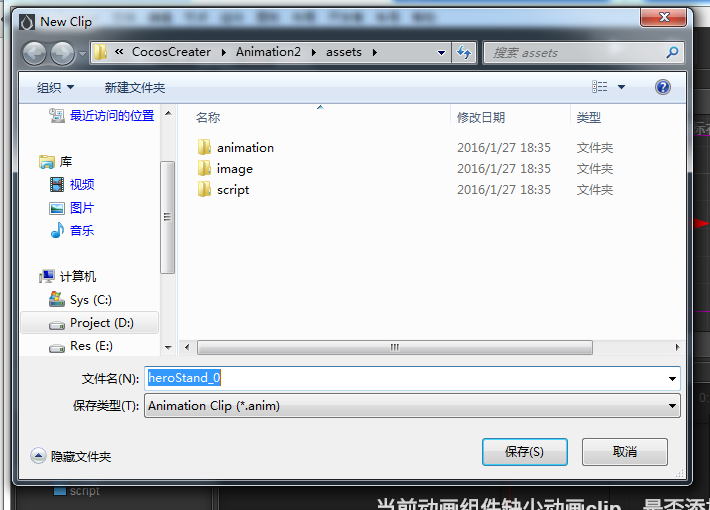 然后选中 hero 点击界面中间下方的动画编辑器 点击添加Animation组件->新建AnimationClip -> 名字取为 heroStand_0 保存